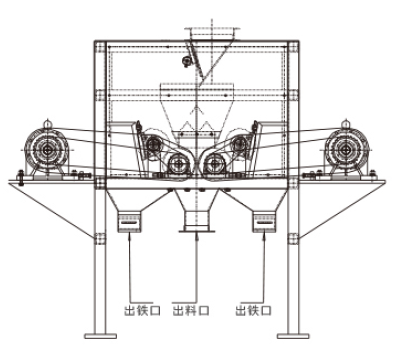 DHD型對輥干式磁選機是我公司經多年市場經驗研發的一種新型干選設備。其磁系經過特殊設計、屬于永磁局部半閉合磁系結構;磁感應強度大并且可在13000GS~20000GS范圍內進行調節。將物料均勻的送到磁選區域后,在設備的磁選區受到重力和磁場力的作用下,利用物料的磁性差異有不同的運動軌跡實現分離,磁性礦物被吸附在磁輥表面旋轉到達精礦區,毛刷將吸附在磁輥表面上的磁性礦刷脫。該機對粉礦率較少但又均勻的中小顆粒狀礦石分選效果卓越,生產效率高,操作簡單方便。適用于硅粉、石英石、鋯石、長石等細粒級的非磁性礦石去除磁性物提純作業。
